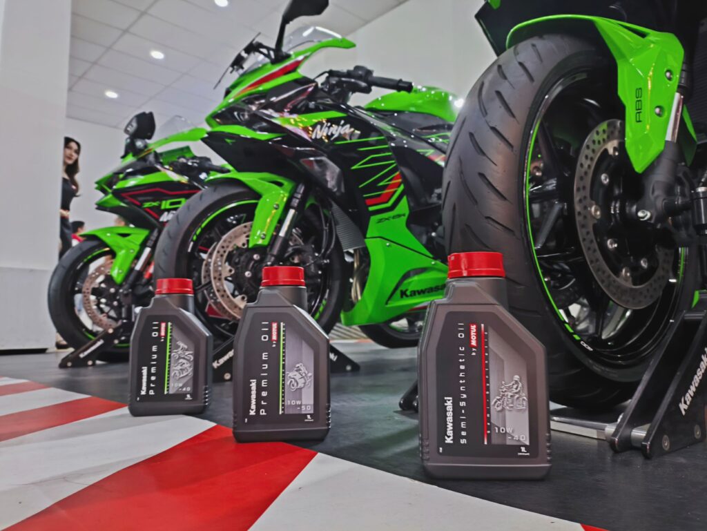 Pelumas pertama yang diluncurkan ada Kawasaki Semi-Synthetic Oil by Motul yang tersedia dalam viskositas 10W-40. Oli ini cocok digunakan